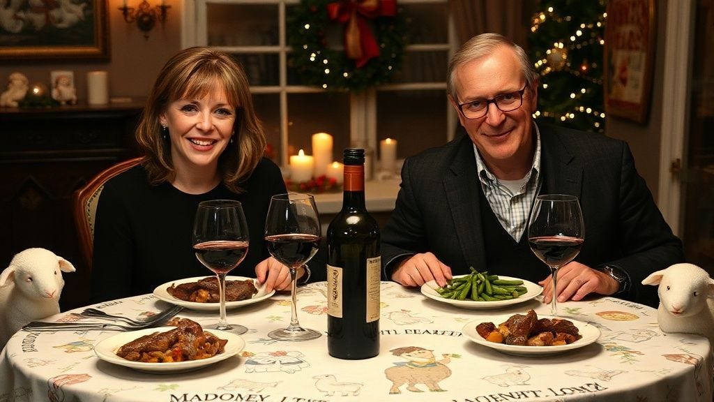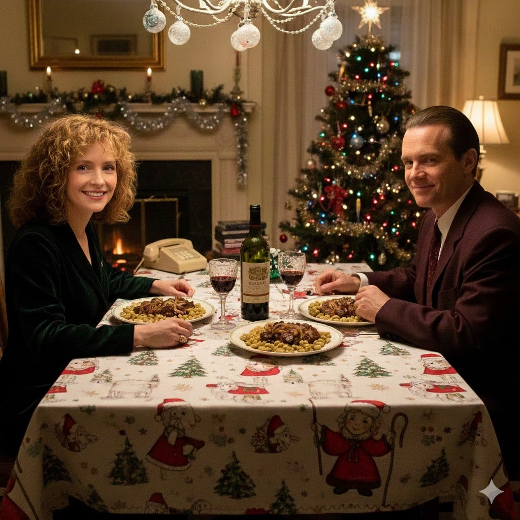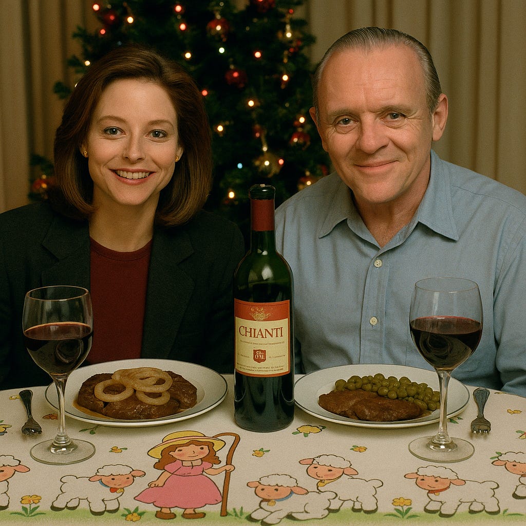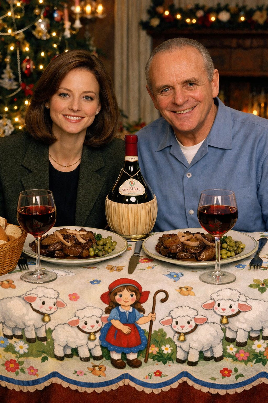 “create a 1990s holiday dinner setting, with Jodie foster (as Clarice starling) and Anthony Hopkins (as hannible lecter) sitting at a dinner table smiling at the camera, with plates of liver and onions and fava beans in front of them, and a bottle of chianti on the table, with filled wine glasses. The table cloth should feature cute cartoon lambs and a girl shepherd design”
