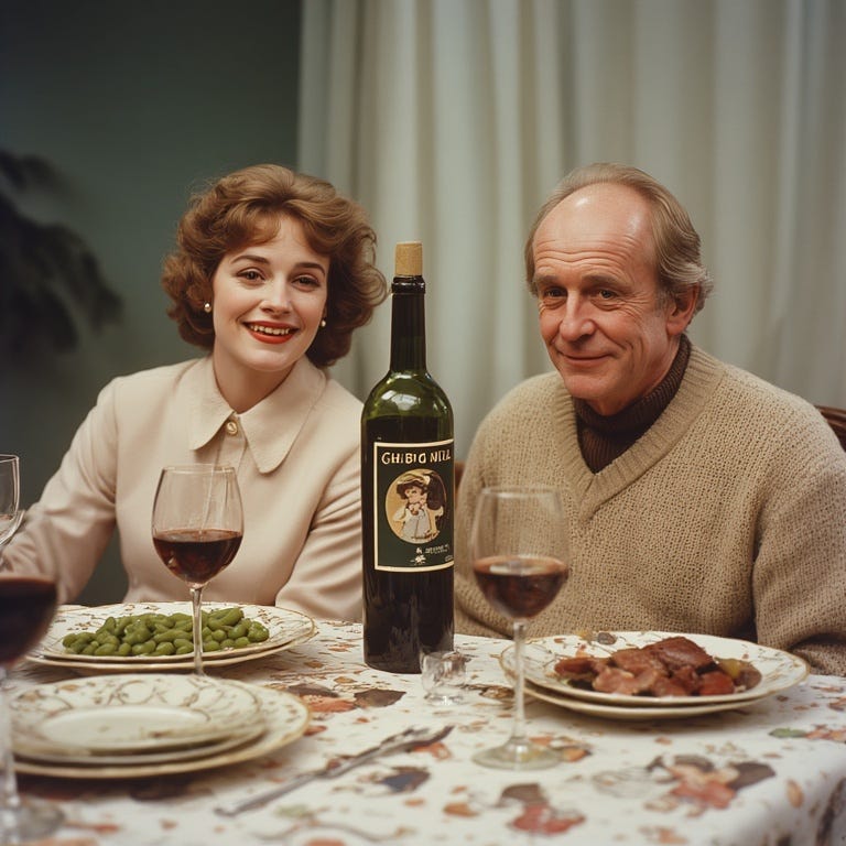 Again, not even close. I have no idea who those people are, why the guy’s plate is just green beans, she’s a double fisted drinker and instead of lambs in the tablecloth, they appear to be hand puppets? Can’t even read the label on the bottle. Bizarre AI choices all around.