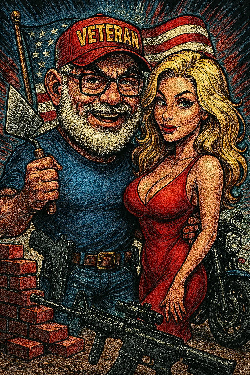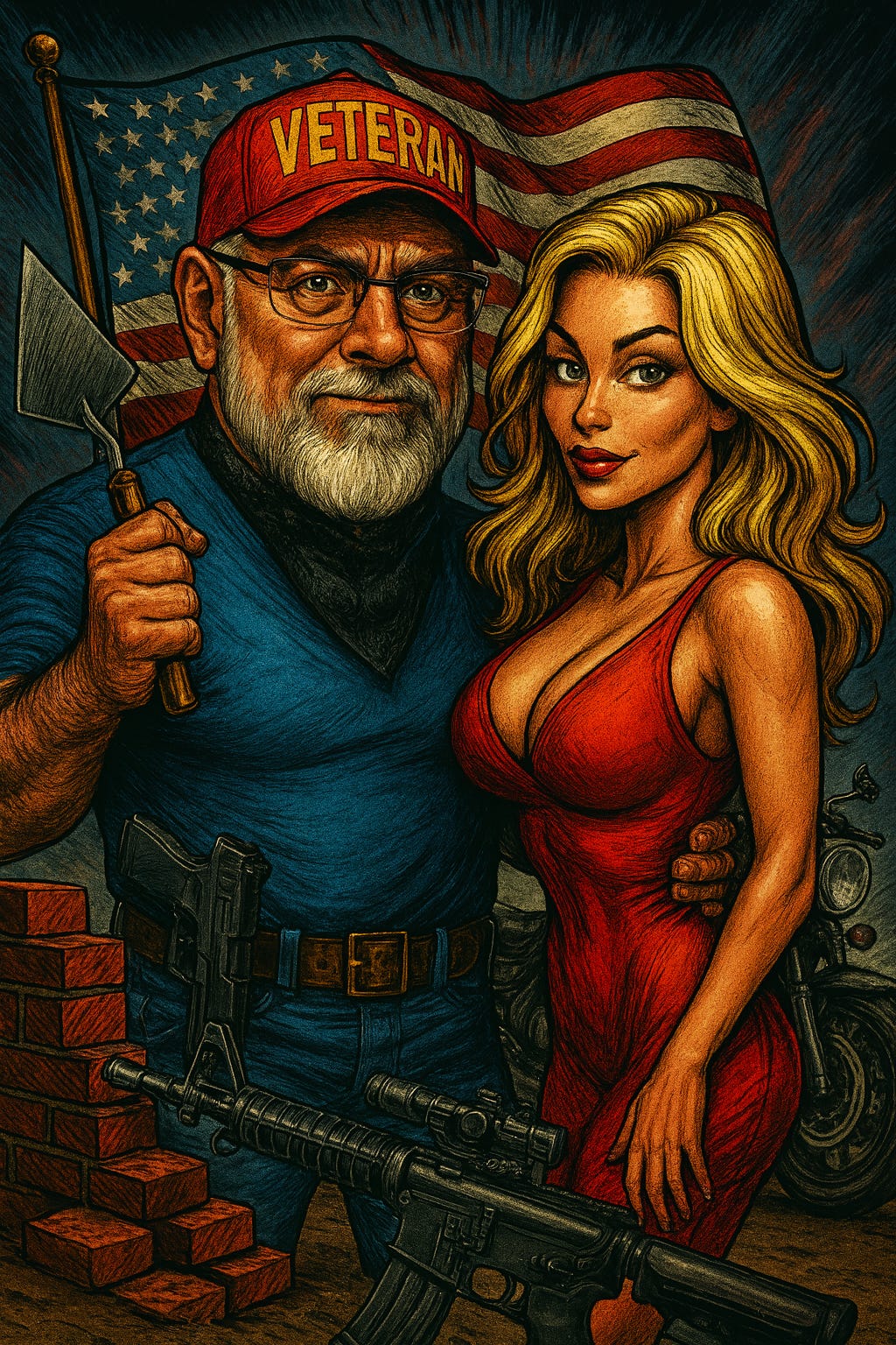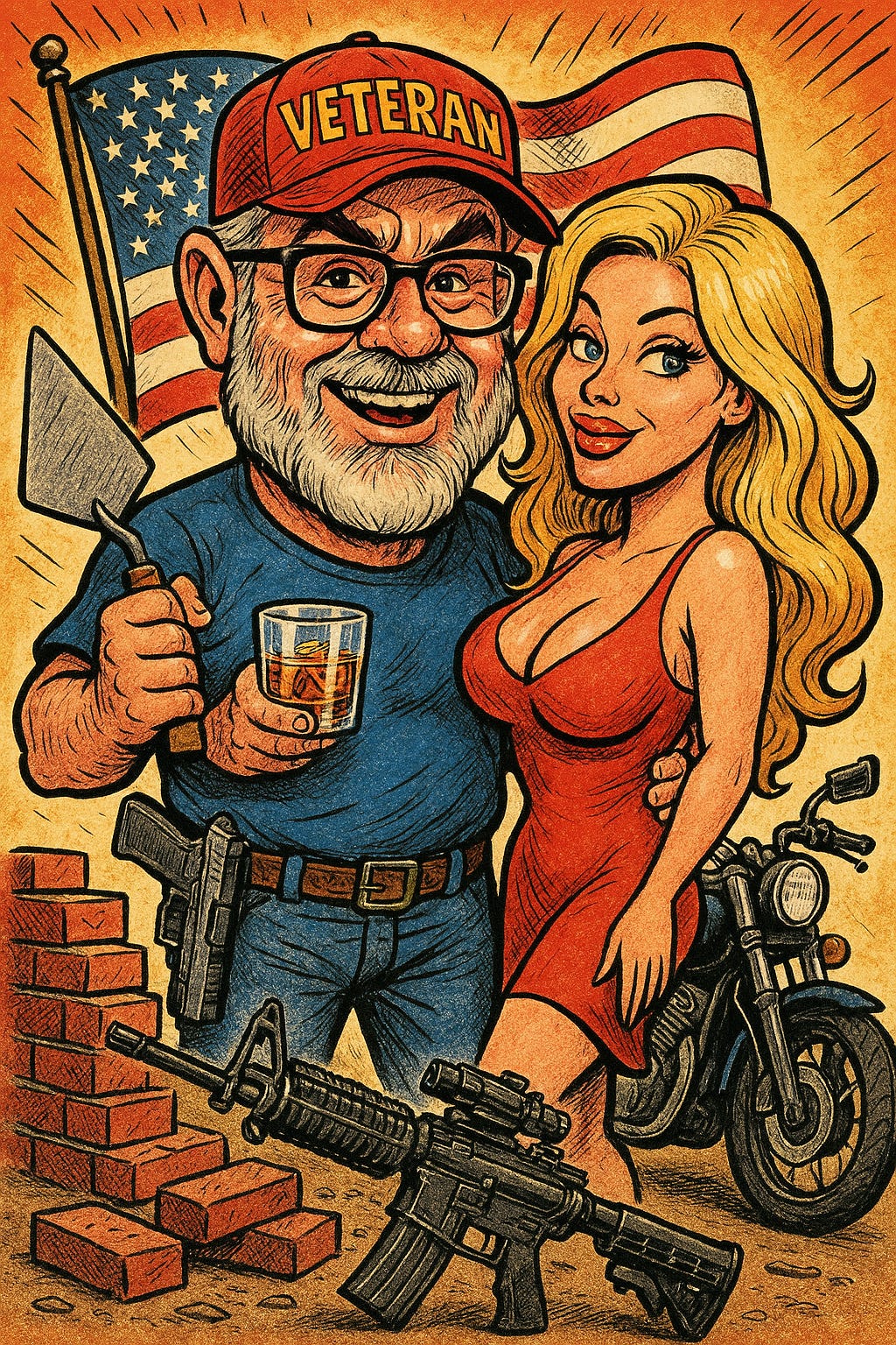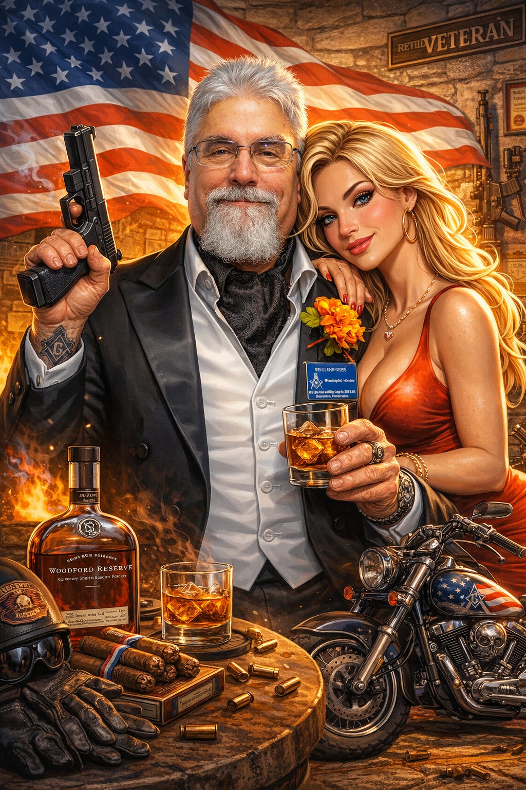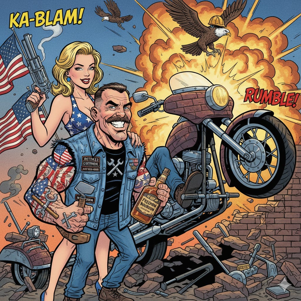 “create a caricature of me using everything you know about me. the vibe should be comedic comic book, adding masonry, motorcycles, firearms, retired veteran, patriotic, bourbon and a sexy curvy blonde female by my side”.